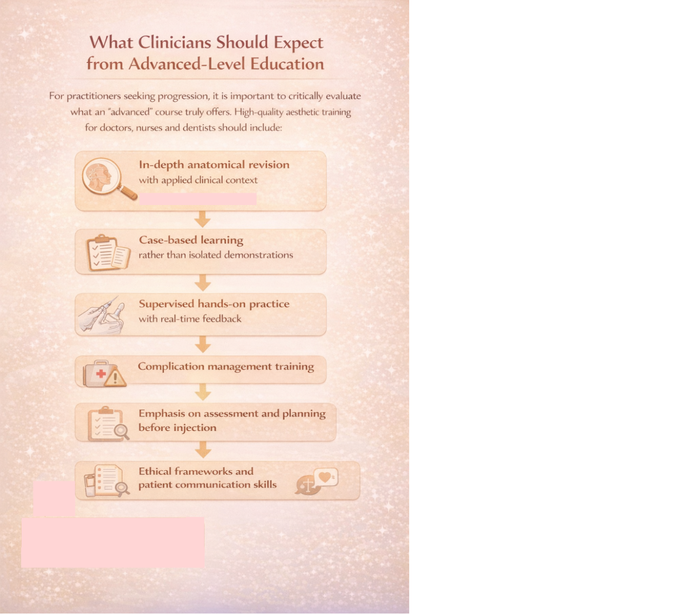 In medical aesthetics education in Scotland, there is increasing emphasis on structured progression pathways rather than one-off masterclasses. This supports sustainable skill development rather than rapid, unsupported escalation into high-risk procedures.